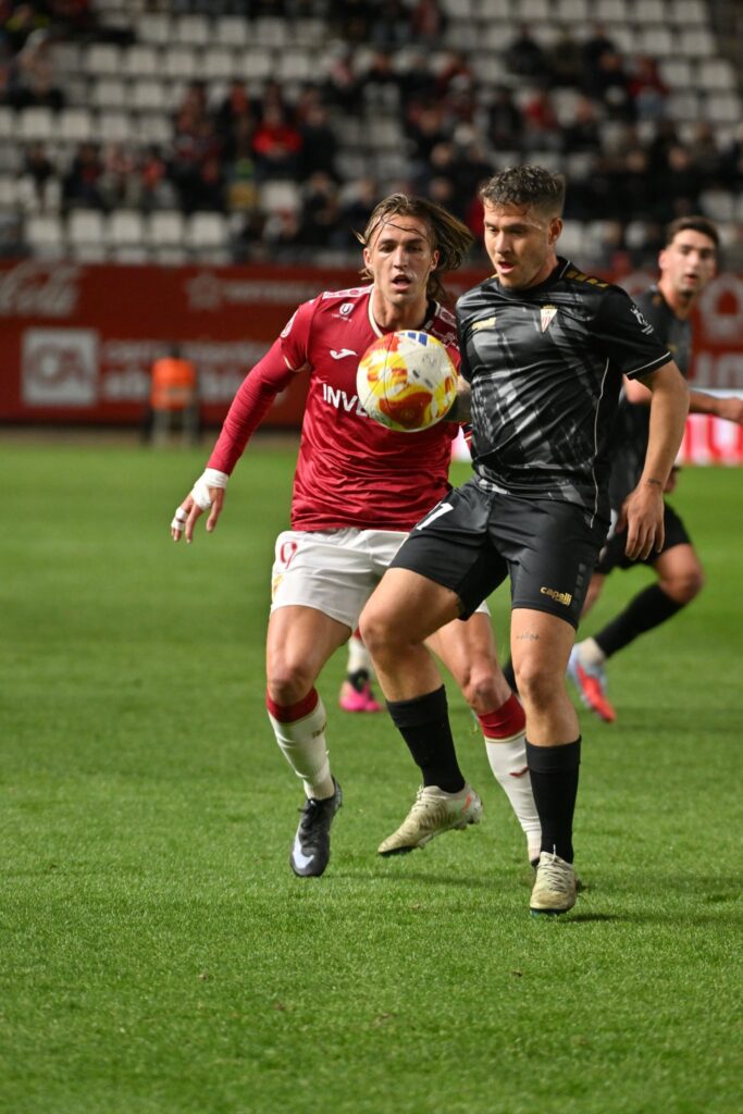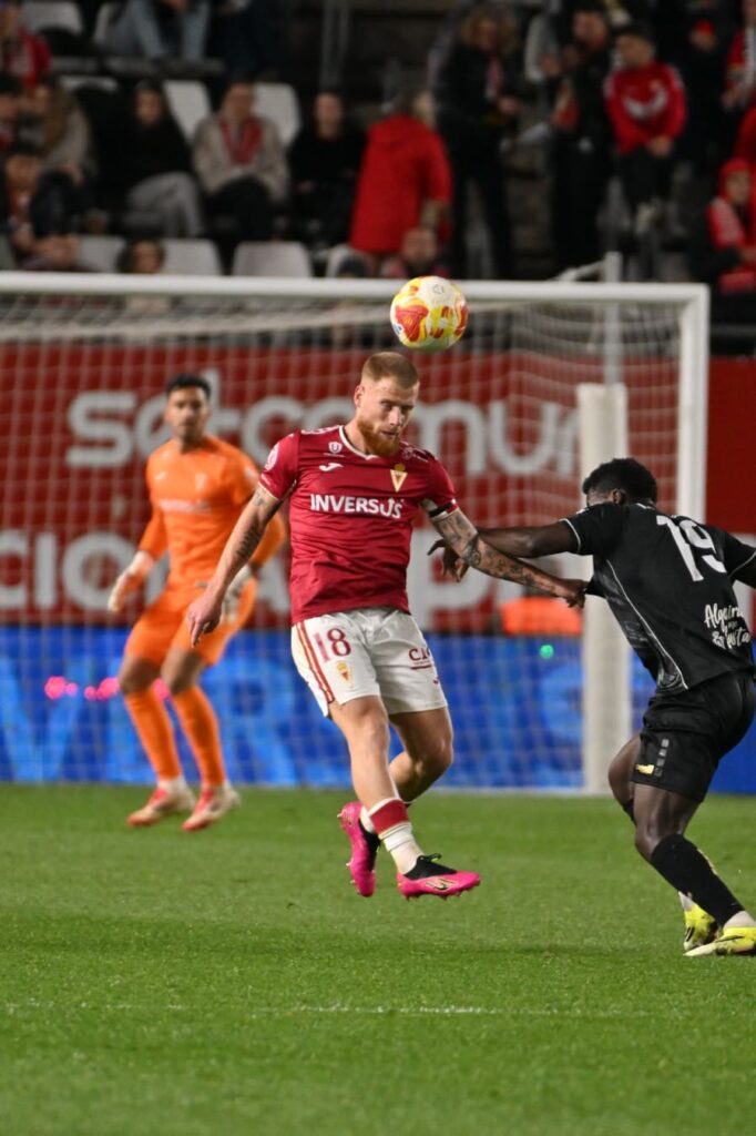 Pedro Benito lucha un balón. Foto: X: @realmurciacfsad