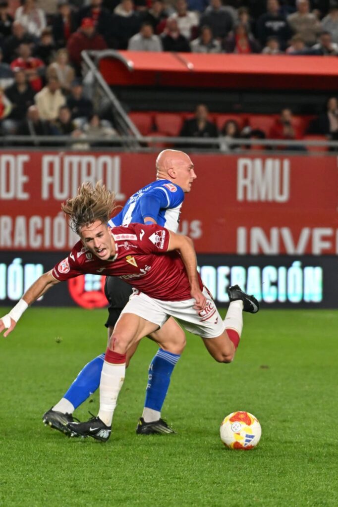 Pedro Benito lucha el balón. Foto: X Real Murcia